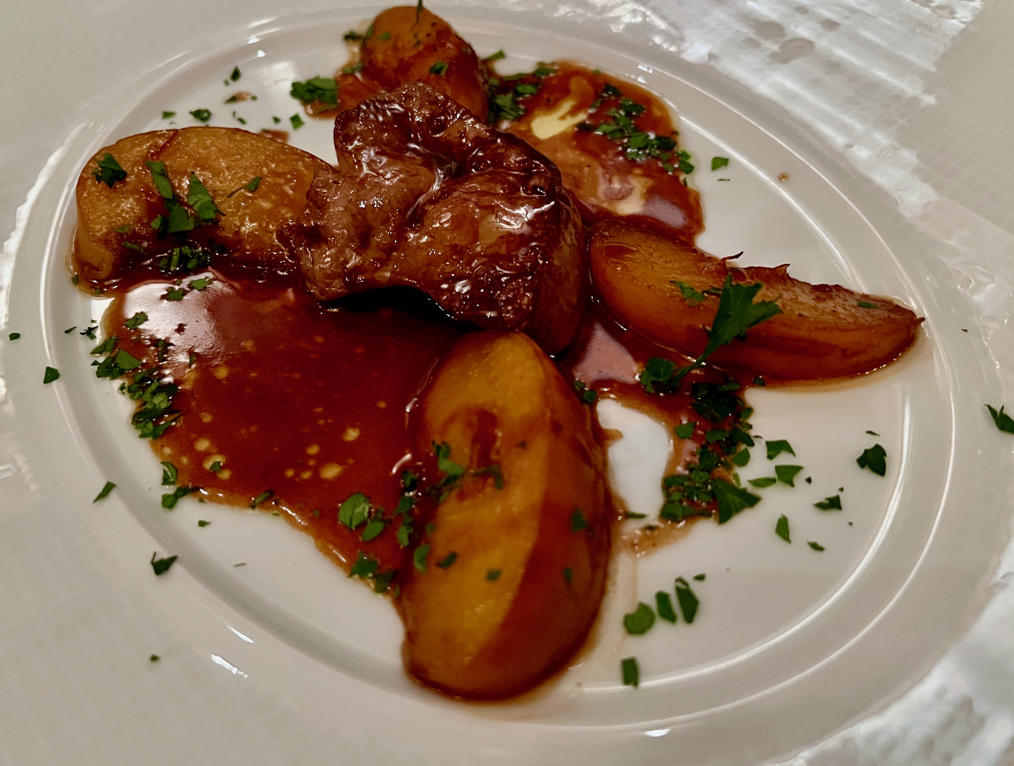 Seared Foie Gras with Poached Apples and Balsamic Reduction.