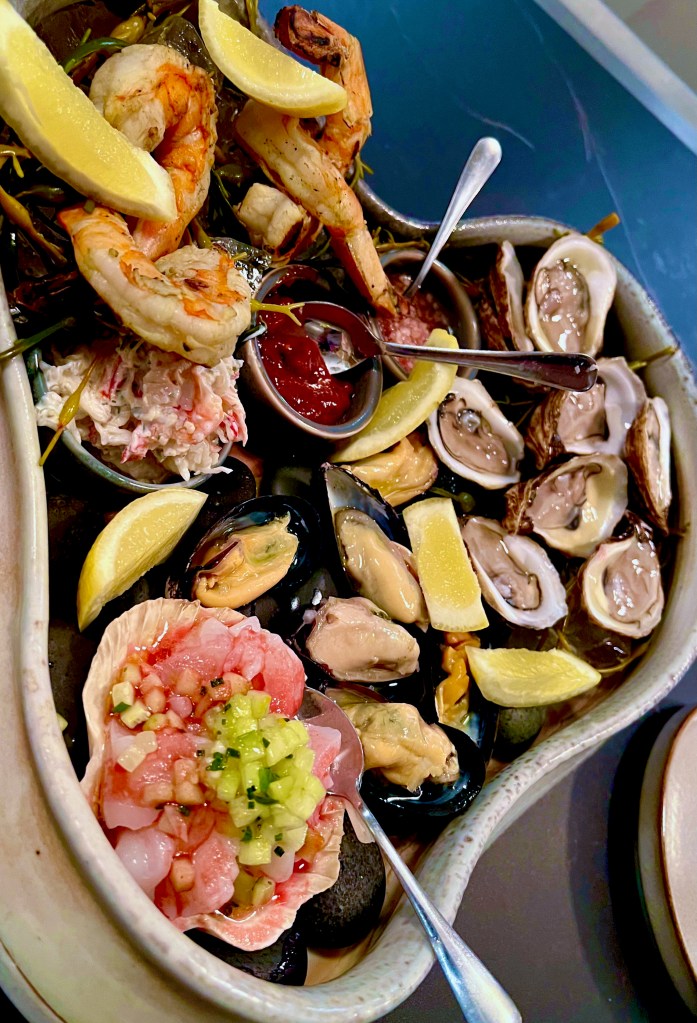 This is what I chose instead of Steak at Atria. Brandt was thinking Gnocchi but being the Sweetest Man in the World he acquiesced due to my passion for seafood. Number 4 is Artria’s version of a Seafood Tower along with a Smoked Salmon Spread with Fresh Fried Potato Chips. James Beard Semi-Finalist Rochelle Daniel put together a custom made pottery vessel full of oysters, shrimp, pickled mussels, ceviche, crab, apple mignonette and cocktail sauce which stands up to all the towers I’ve had including those in Hong Kong and Marseille. I wouldn’t even attempt to make the salmon spread. The flavor had depth but the texture was like silk…how does one do that with smoked salmon? I know the steak would’ve been amazing but we enjoyed every brilliantly composed bite.