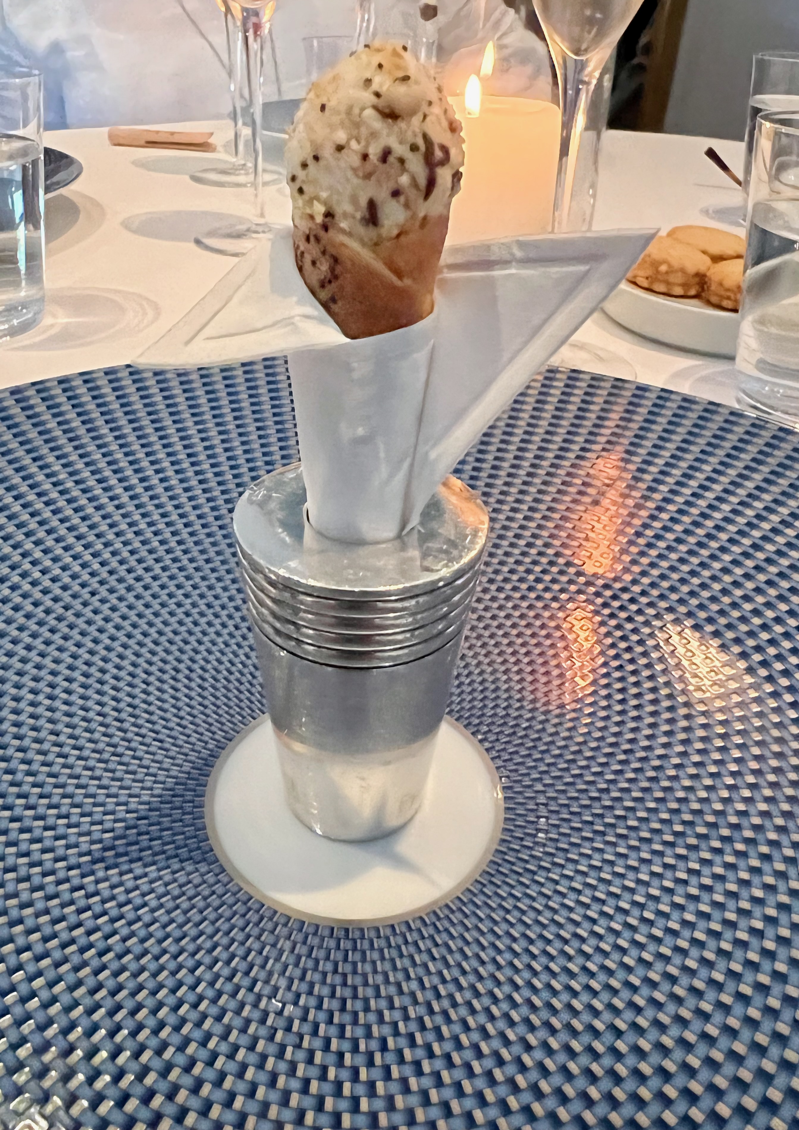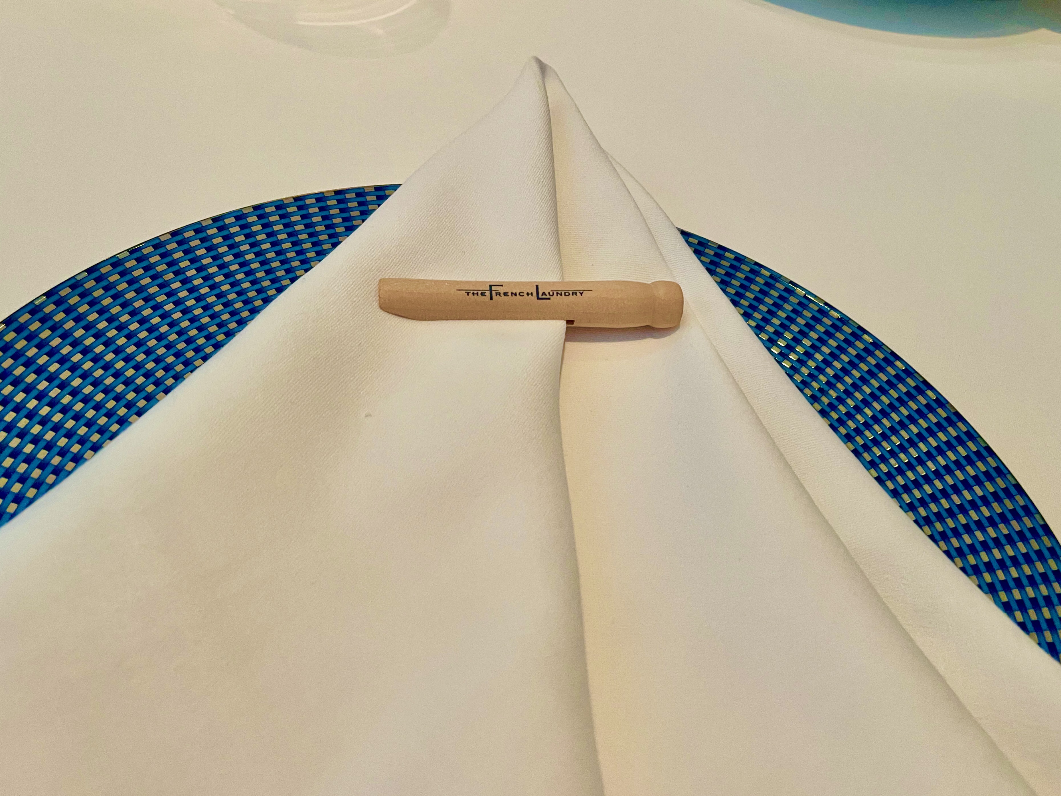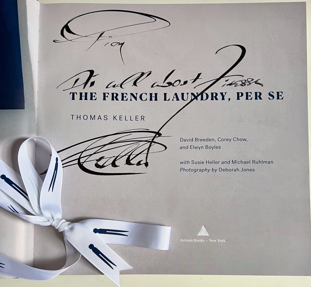 I was already emotional. I had texted Brandt a photo of the exterior saying I was missing My Sweet One. He responded, “Missing you as well but if anyone deserves to experience this restaurant, it is you my dear!” So, I was a mess walking in the door. I was greeted at our table by a signed copy of The French Laundry, Per Se cookbook. My friend’s who joined me for dinner felt like the book was for me and kindly took the other seats. Service Captain Patrick said hello and then said, “I think the book is yours……………Tim”. The pause got me…I was literally moved to tears and couldn’t speak. They literally make it their business to personalize the experience. At the time I didn’t know it was an amazing gift from our friend Thomas Williams. The book was tied with a lovely white ribbon embossed with black laundry pins…Mom called them clothes pins but there is a theme at 6640 Washington Street, Yountville, CA. I didn’t remove the ribbon until I got home because I wanted Brandt to see it just like it was. When I removed the ribbon I found that the dust jacket was holding place for me to open the book to see…