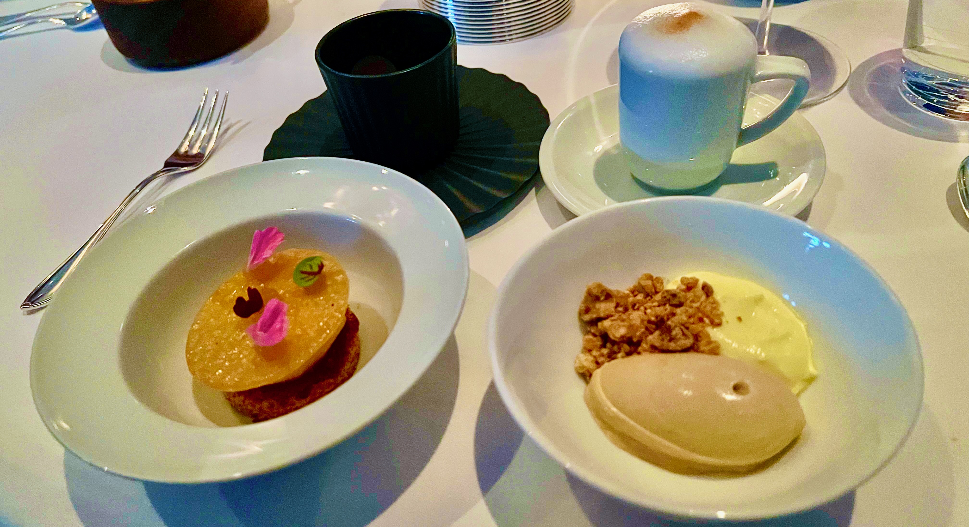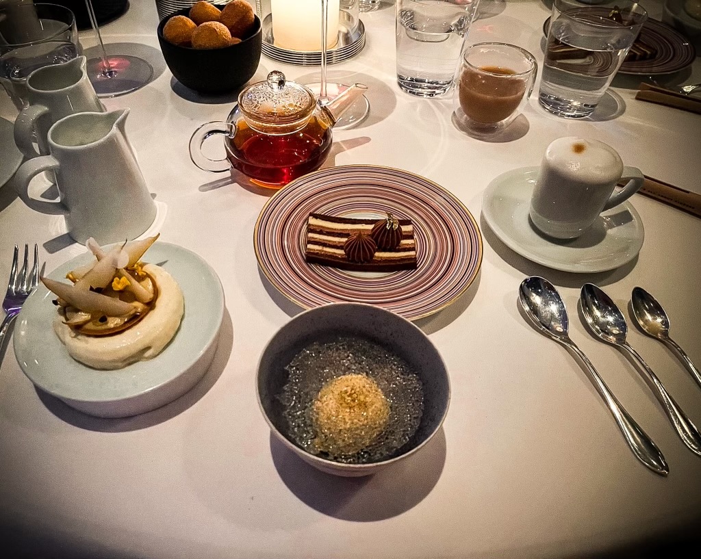 My desserts were…K&J Orchards Poached Fuji Apple | Chai Tea Ice Cream | K + M Chocolate “Pot de Créme” | Frozen Cappuccino. At the top of the second photo the Donut Holes which came with the Coffee and Tea service. Additionally, there was the Mignardises of Mini Yuzu Macaron, Chocolate Covered Macadamia Nuts and Salted Caramels.